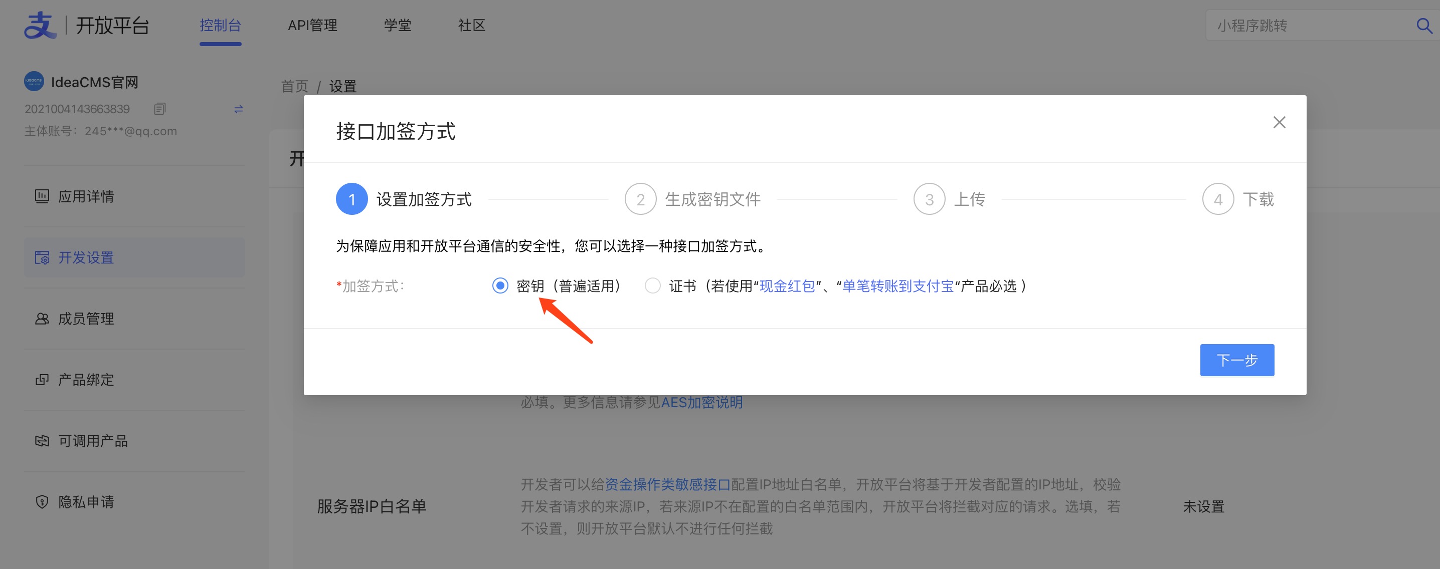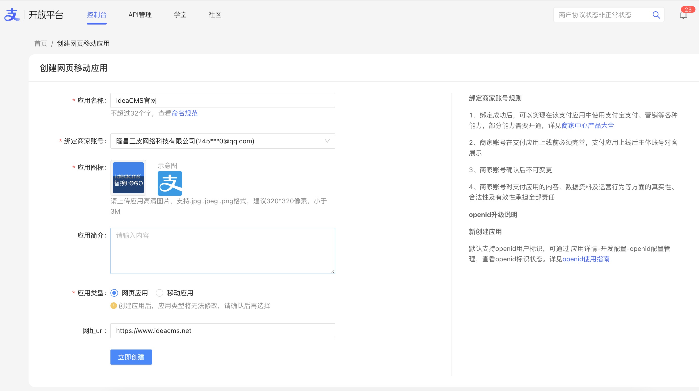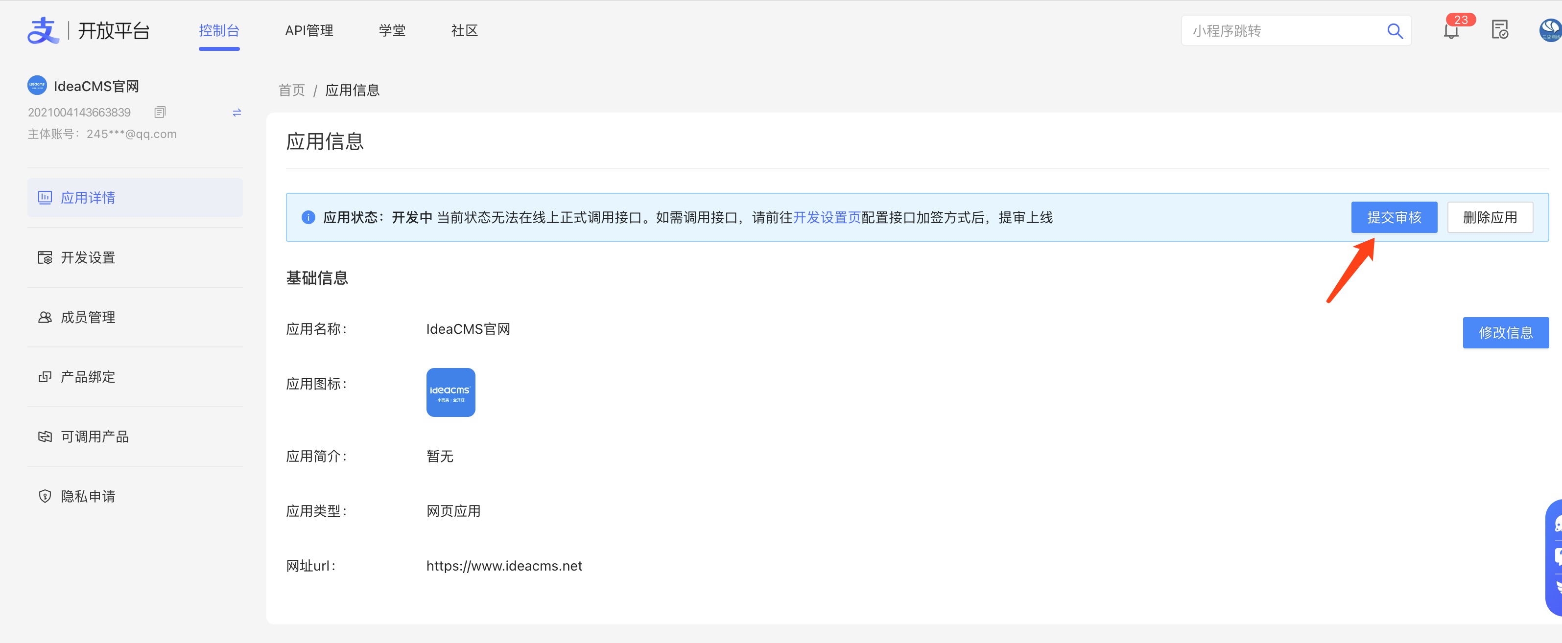 7,返回应用详情-提交审核。下图中“IdeaCMS官网”下方的2021****3839即为应用APPID。复制到商城系统后台-支付宝设置-应用APPID。