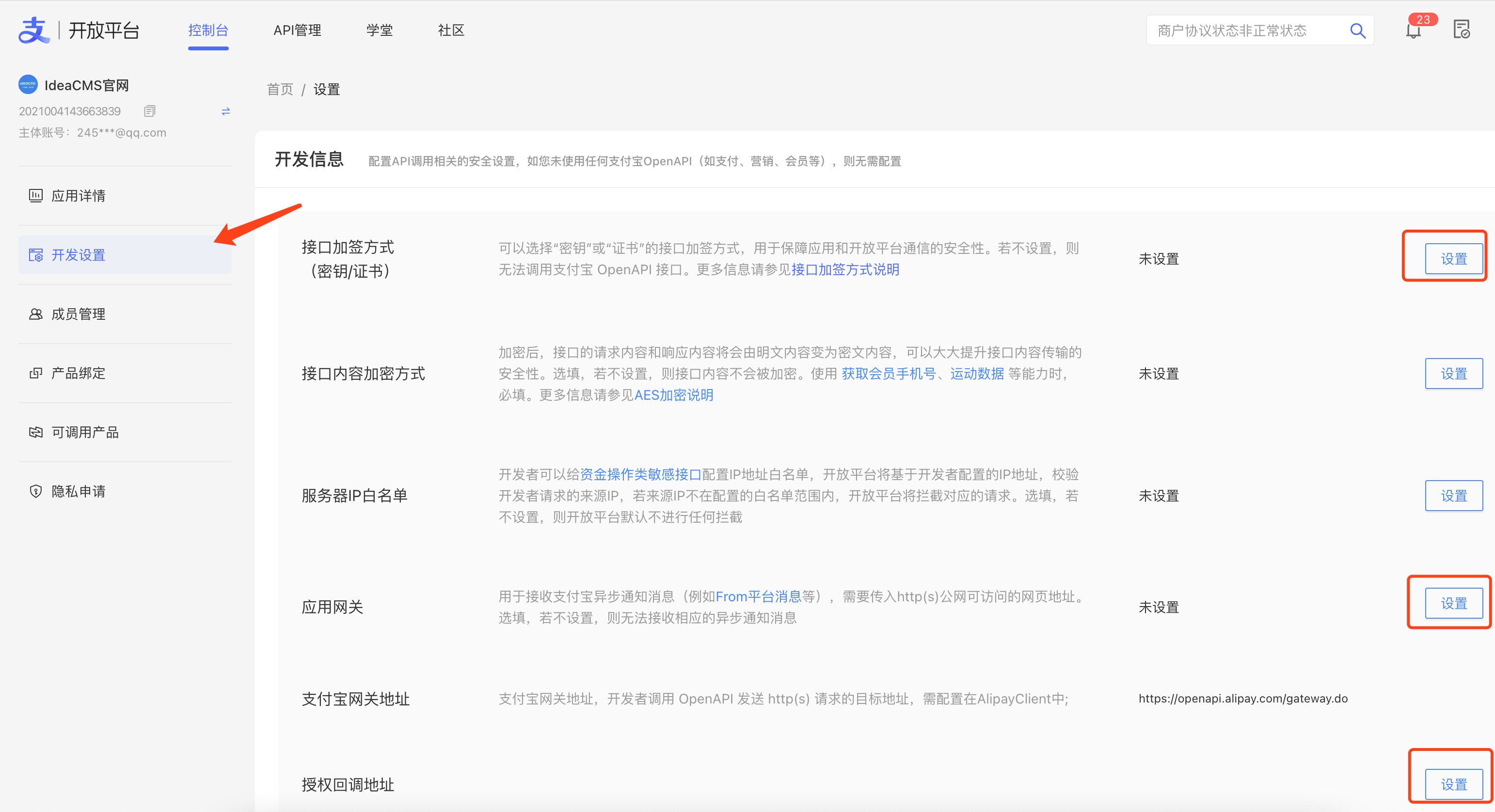 3,进行相关配置,主要是支付宝公钥和应用私钥获取,有点绕;应用网关和授权回调地址按照后台-支付宝设置里面的地址填写。
