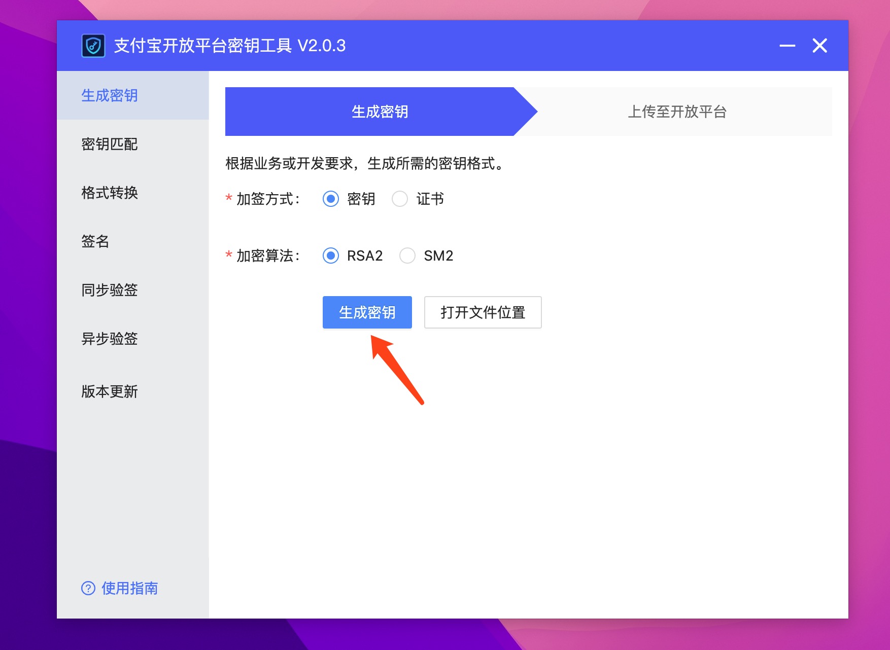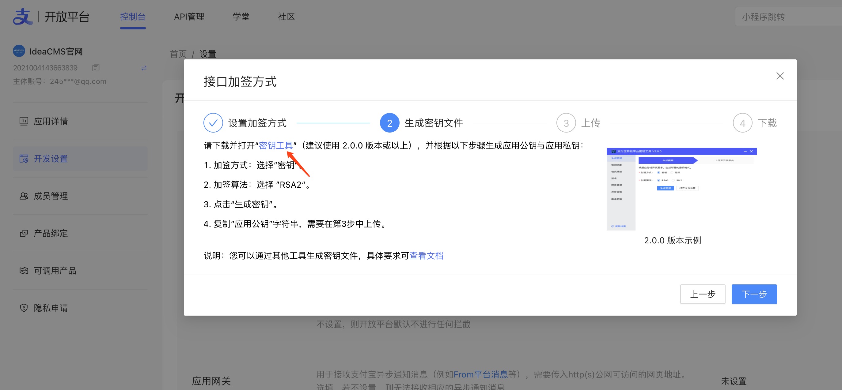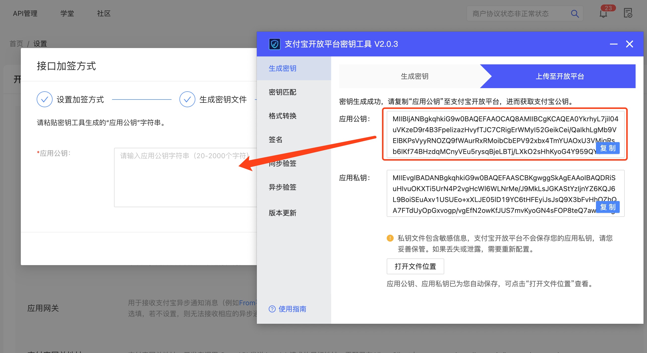 5,打开下载的工具,将应用公钥复制到上一步应用公钥里,将应用私钥填入商城系统后台支付宝设置-应用私钥。