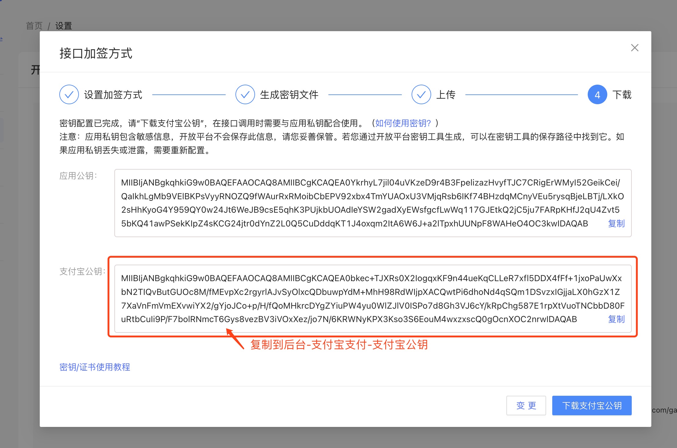 6,将生成的支付宝公钥复制到商城系统后台-支付宝设置-支付宝公钥里。